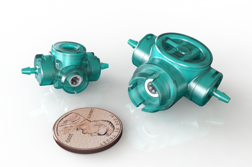 Due to these properties, Quantex pumps allow for flexibility in the design of an integrated system. Fittings on the inlet and outlet of the pump can either be standard (luer, hose barb) or custom fittings, allowing for easy integration of the pump in-line. The simple rotary action of the Quantex pumps means flow is easily controlled with a motor: the speed of the motor controls the flow rate, and the number of revolutions determines the volume pumped. Furthermore, the pumps have a low torque requirement which means the device can readily be battery powered. Since the information required to control the pump is simple, different wireless communication methods can be used to transfer information to and from the device.