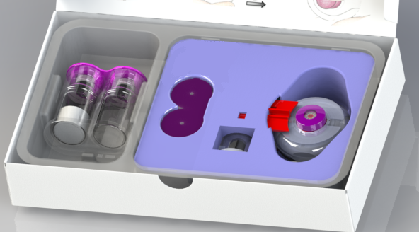 From the point of view of the patient using the Enable device, the first thing they are presented with is a small box (approximately 15 cm by 12 cm, and quite flat at only 4.5 cm high). On opening the box (see Figure 3a) the patient sees inside: on the left, a standard vial or cartridge containing their medication; and to the right, the injector device (roughly the size of an “Oreo” biscuit – just over 4cm across) in a plastic housing. One-word instructions with simple graphic illustrations are printed on the inside of the lid. The three simple patient steps for drug transfer are shown in Figure 3a-c.
