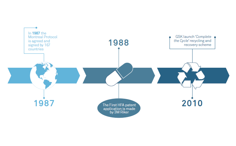 In 1987, the Montreal Protocol was agreed and signed by 167 countries, due to growing global concerns over the depleting ozone layer. The agreement was designed to protect the environment by phasing out the use of harmful substances, including chlorofluorocarbon (CFC) propellants which were widely used in pressurised inhalers at the time. This change had two important effects: it triggered development of alternative hydrofluorocarbon (HFA) based propellants and prompted more research effort into other device-reliant drug-delivery methods such as dry powder inhalers – which work without propellants, instead using patients’ respiratory effort to aerosolise the drug.